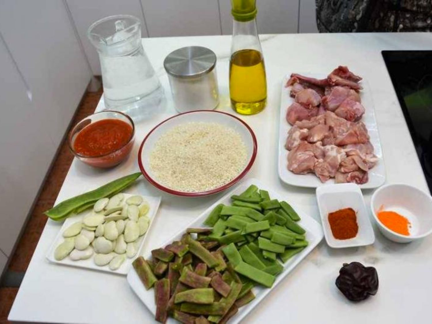 Además, se utilizan 4 cucharadas de tomate natural tamizado, que contribuye con un sabor dulce y ácido equilibrado, 5 cucharadas de aceite de oliva virgen extra para freír y amalgamar los sabores, y 150 gramos tanto de conejo como de pollo, proporcionando la base proteica. Finalmente, ½ cucharadita de pimentón añade un toque ahumado y color a este sofrito fundamental.