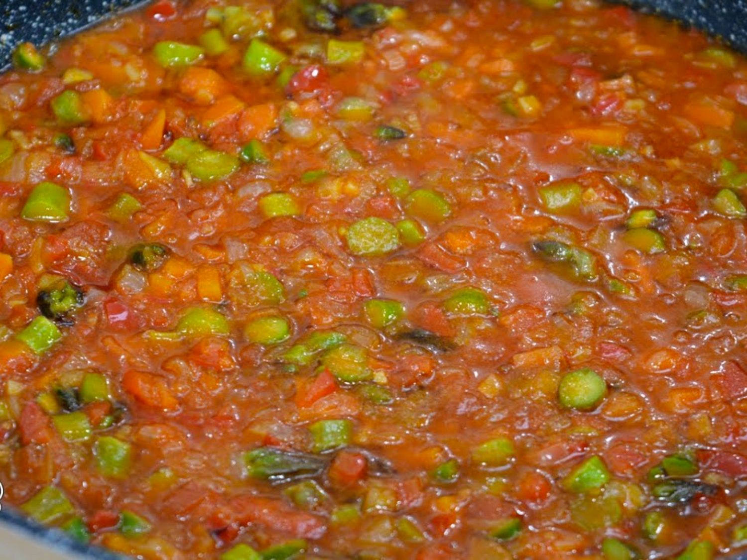 Añade el pimentón, mezclando bien con el resto de ingredientes. Este es el momento adecuado para remover el sofrito, antes de añadir el arroz. Una vez listo el sofrito, se añade agua hasta casi el borde de la paella, cocinando para crear un caldo durante 25 minutos antes de incorporar el arroz y el azafrán, dando los últimos pasos para completar este icónico plato.