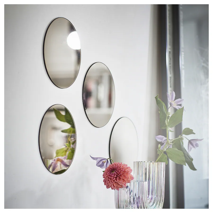 Si quieres darle a tu salón un aspecto moderno y original, descubre estos 4 espejos decorativos redondos FÄRGEK y sorprenderás a todas tus visitas. Cuatro espejos pequeños ya que no tienen más de 20 centímetros de diámetro y que cumplen una función más decorativa que funcional. Con este pequeño tamaño no valen para ver tu look mañanero, pero pueden quedar genial encima de tu sillón en el salón.