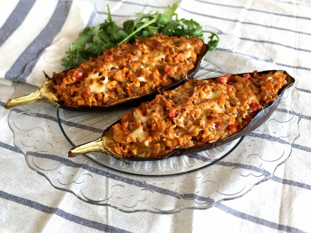 - Llena las mitades de berenjena con la mezcla de carne y verduras. Presiona ligeramente para compactar el relleno.