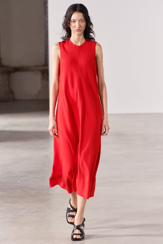 Otro de los vestidos que pueden ser perfectos para esta noche romántica es este confeccionado en hilatura con mezcla de viscosa. Un original vestido de cuello redondo y manga sisa con bolsillos laterales ocultos en costura que puede quedar perfecto en rojo. Cuenta con un detalle de costuras marcadas a tono y cierre en espalda con cremallera oculta en costura. Un vestido que se puede encontrar en las tiendas físicas y la web a 49,95 euros.