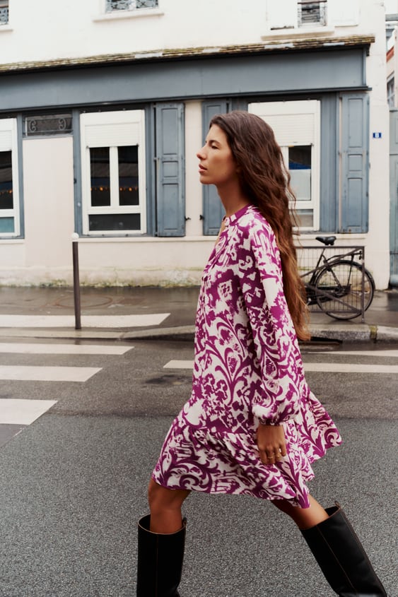Nos encanta este vestido mini estampado de cuello redondo con escote pico y manga larga acabada en elástico. Sorprende por el detalle de jaretas delanteras y bajo acabado con volante y su cierre frontal con botones. Un vestido perfecto para lucir con unas botas altas y una chaqueta larga de punto. Puedes encontrar este vestido en las tiendas físicas y la web de Zara a un precio de 29,95 euros.