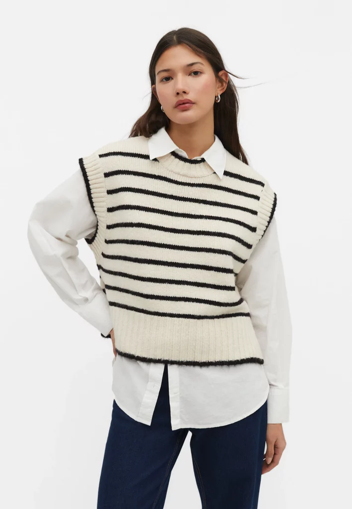 Una de las tendencias que siempre triunfa son los chalecos de rayas. A nosotros nos ha encantado este chaleco de punto rayas de Stradivarius con cuello redondo y manga sisa en tono vainilla con unas líneas finas horizontales oscuras. Sorprende por sus acabados en rib y un práctico bajo acabado con abertura en los laterales. Este moderno chaleco tiene un precio en la web de Stradivarius de 19,99 euros y ha sido elaborado con un 79% acrílico y un 21% poliéster. Un chaleco original y suave al tacto perfecto para cualquier momento y situación.