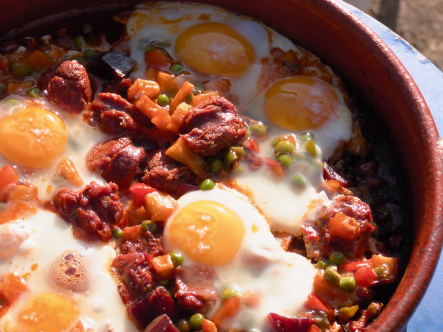 El toque final lo dan los taquitos de jamón y el chorizo previamente sofrito, junto con los huevos. Cubre la sartén para que los huevos se cocinen al vapor con el resto de ingredientes. Una vez listo, sirve este colorido y sabroso plato que seguro deleitará a todos en la mesa.