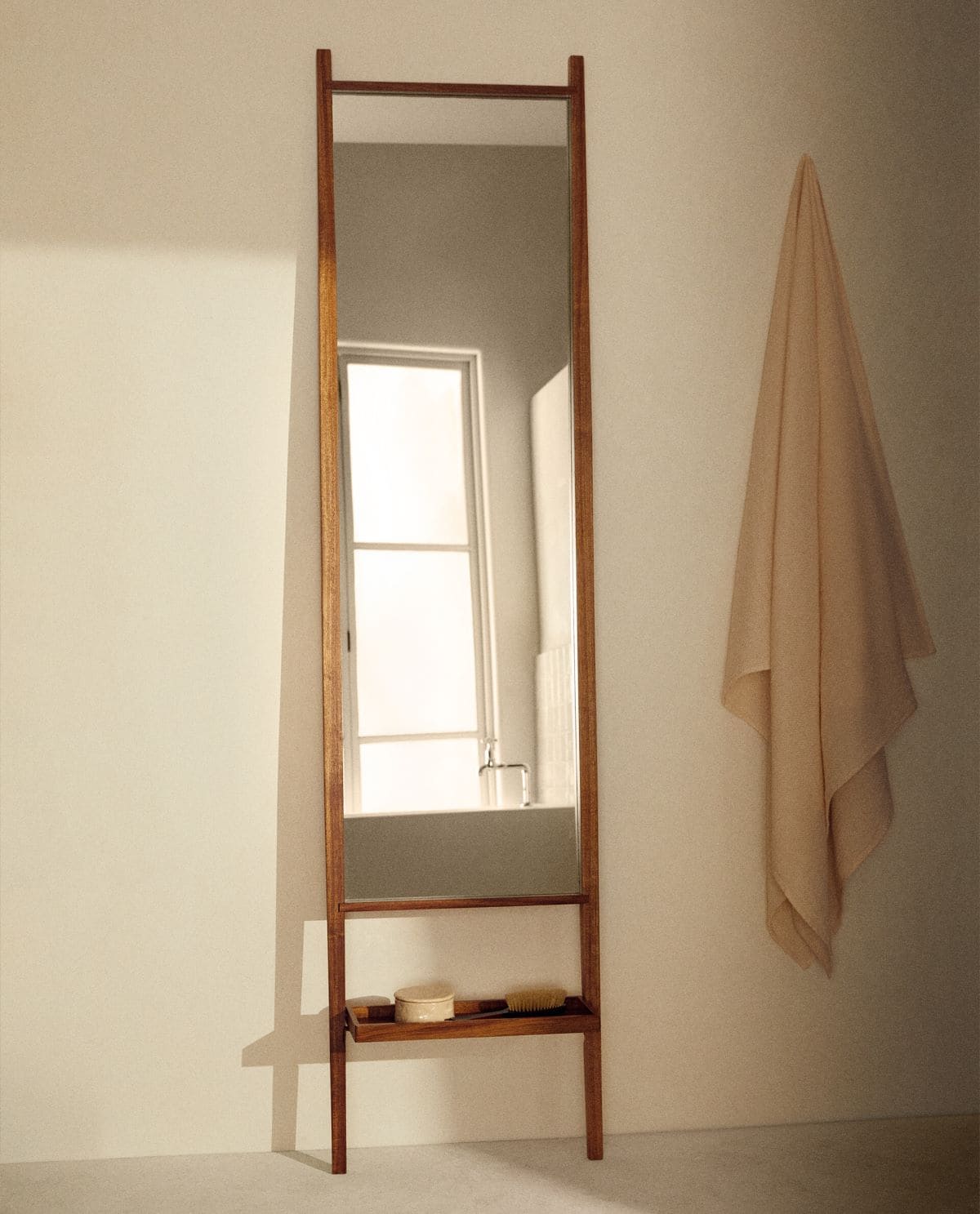 Echando un vistazo por los mejores complemento de Zara Home, también te llamará la atención este otro espejo espectacular. Con cuerpo estrecho, alargado y diseño rectangular, destaca por haberse fabricado con un 40% de madera de acacia, un 30% de vidrio y un 30% de fibra de madera de densidad media. Además, tiene dos robustas patas para que lo puedas colocar sobre el suelo, aunque se debe ubicar en una pared que sirva de soporte para que mantenga el equilibrio. Por otro lado, cuenta con una balda de almacenamiento muy útil y su precio es de 139 euros. Sin duda, una gran inversión para hacer tu hogar más elegante.