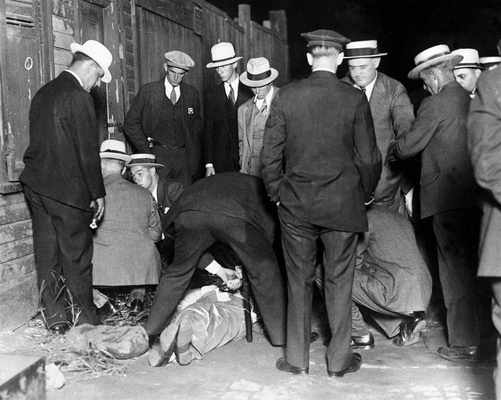 El 14 de febrero de 1929, siete miembros de la banda de Moran fueron asesinados a tiros en un garaje en North Clark Street en Chicago. Los hombres, vestidos como policías, ingresaron al garaje y ordenaron a los miembros de la banda de Moran que se alinearan contra la pared. Luego, abrieron fuego con ametralladoras Thompson, matando a seis de ellos instantáneamente. Uno de los hombres logró sobrevivir al tiroteo, aunque quedó gravemente herido.