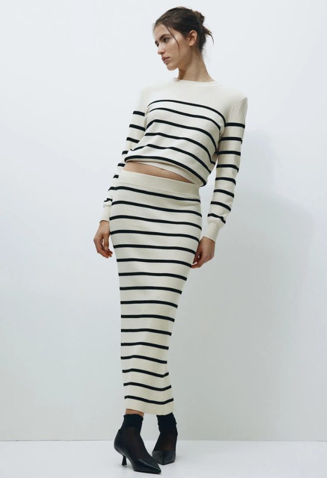 Dentro de la sección de novedades de H&M no pueden faltar esos básicos imprescindibles para llenar tu armario de primavera con prendas de infarto. Si estás buscando un conjunto ideal para ponerte en esos días en los que no sabes cómo vestirte, este de jersey y falda, con rayas horizontales oscuras sobre fondo claro, se convertirá en tu mejor aliado. De diseño ajustado, la falda cuenta con una abertura trasera ideal para estilizar tu figura. De nuevo, podrás combinar las prendas con otras para crear decenas de looks distintos. En cuanto a su precio, el jersey lo puedes encontrar por 29,99 euros y la falda por 25,99.