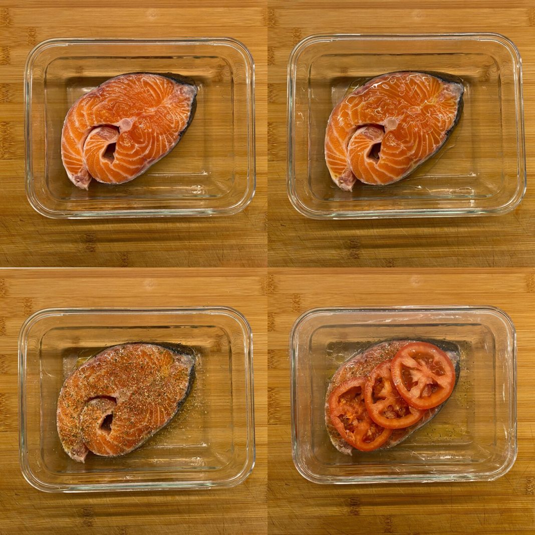 Luego, corta un tomate en rodajas y cubre la rodaja de salmón con dos o tres piezas, según sea necesario. Cubre la fuente con papel film, asegurándote de pinchar la superficie para que pueda salir el vapor que se generará durante la cocción. Una vez preparado, introduce la fuente en el microondas y programa cuatro minutos a máxima potencia. Puedes ajustar la potencia según la potencia de tu microondas, en este caso se ha utilizado una potencia de 780W.