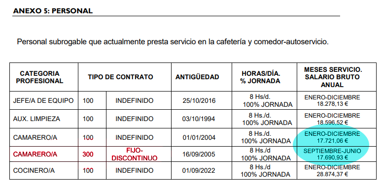 De hecho, el fijo-discontinuo del SEPE cobrará 30 euros brutos menos anuales, hasta los 17.690,93 euros frente a los 17.721,06 euros de su compañero. El auxiliar de limpieza cobrará 18.596,52 euros, casi 250 euros más que la jefa de equipo, con un sueldo de 18.278,13 euros. El cocinero, por su parte, ostentará 28.874,37 euros. Todos ellos atenderán a un máximo de 50 personas en el interior de las instalaciones.