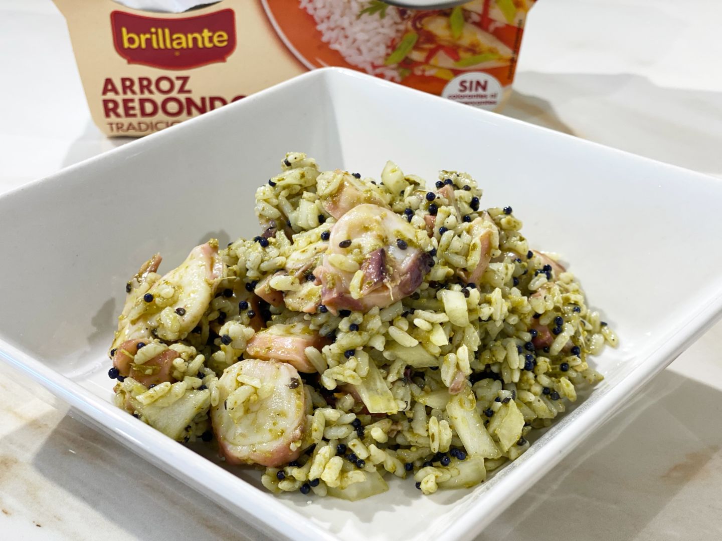 Una vez que el arroz esté enfriado, lo mezclamos con el pesto y la cebolleta picada fina, añadiendo un toque de pimienta negra. Cortamos el pulpo en rodajas o tacos medianos y lo mezclamos con zumo de limón.