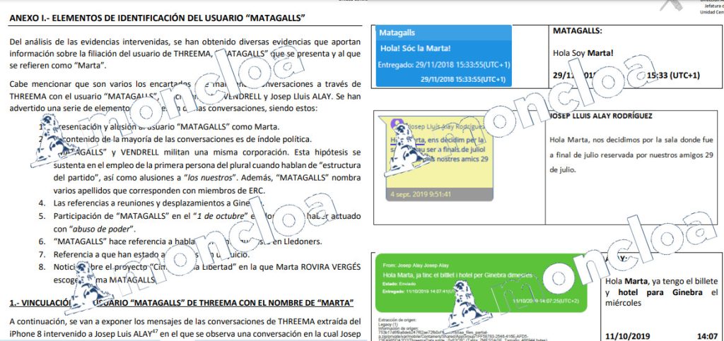 Los agentes sostiene en algunas de sus conclusiones que hay una «presentación» y alusión al usuario ‘Matagalls’ como Marta, ‘Matagalls’ y (Xavier) Vendrell militan en una misma corporación. Esta hipótesis se sustenta en el empleo de la primera persona del plural cuando hablan de «estructura del partido», así como alusiones a «los nuestros». Además ‘Matagalls’ nombra varios apellidos que corresponden «con miembros de ERC», ‘Matagalls’ hace referencia a gente que está en Lledoners (cárcel donde estuvieron presos los políticos del procés) y noticia sobre «el proyecto ‘Cimas por la libertad’ en la que Marta Rovira Vergés escoge la cima ‘Matagalls’».