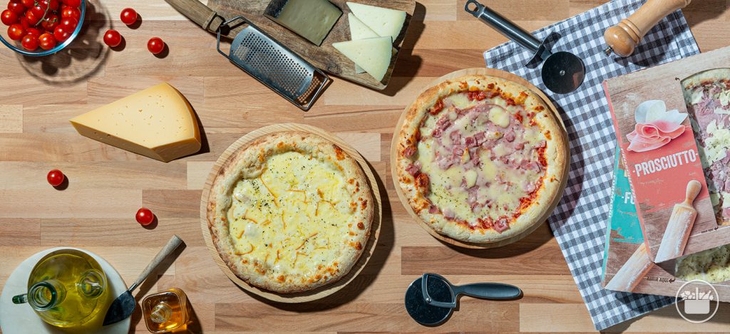 La pizza de masa madre de prosciutto cuenta con una base de tomate, mozzarella y jamón cocido. Se pueden añadir otros ingredientes como rúcula o unos tomates cherry cortados por la mitad. La pizza de masa madre formaggi cuenta con una base de queso provolone, mozzarella, queso curado y queso cheddar. Se puede añadir también un toque extra de tomillo o albahaca puede realzar los sabores de los quesos.