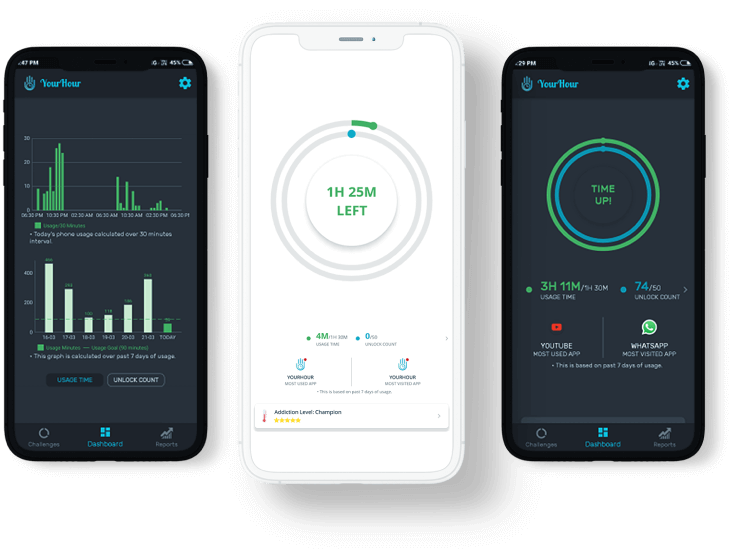 Your Hour es una aplicación diseñada específicamente para ayudar a las personas a controlar su adicción al smartphone. Ofrece una variedad de funciones que permiten a los usuarios monitorear y gestionar su tiempo en el teléfono de manera efectiva. Por ejemplo, la aplicación proporciona estadísticas detalladas sobre el tiempo total de uso, las aplicaciones más utilizadas y los momentos del día en los que se utiliza más el teléfono. Además, permite establecer límites de tiempo para cada aplicación y recibir alertas cuando se excede ese límite. También cuenta con una función de «modo de concentración», que bloquea temporalmente el acceso a ciertas aplicaciones para ayudar a evitar distracciones.