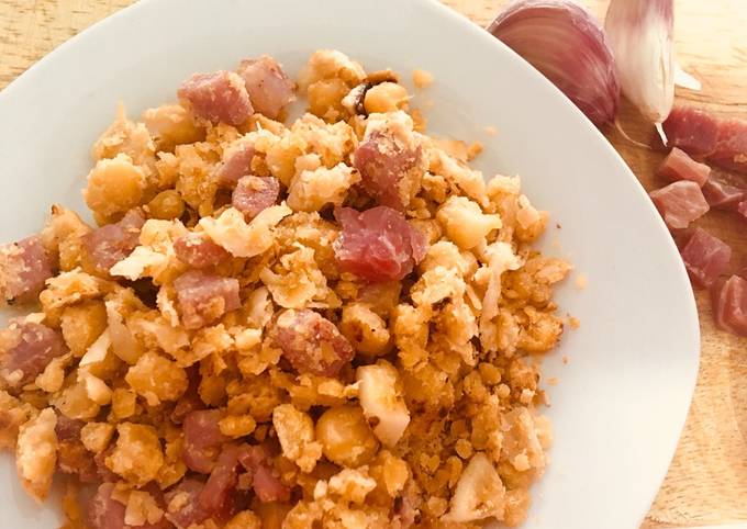 - Reserva algunas tiras de jamón para decorar al final. El contraste entre la textura crujiente y las migas es un placer para el paladar.
