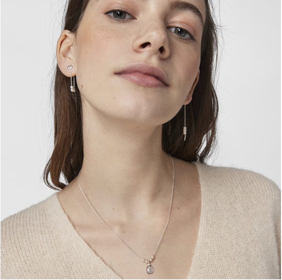 El colgante, pieza central de este dúo encantador, presenta cuatro perlas cultivadas de agua dulce, redondeadas con precisión, y una medalla con la figura del sol. Los pendientes, elegantes y largos, replican la misma medalla y añaden una estrella que brilla con su propio encanto. Pero la verdadera magia radica en su diseño convertible, permitiéndote ajustarlos a tu estilo, convirtiéndolos en pendientes cortos con colgante según tu preferencia del día.