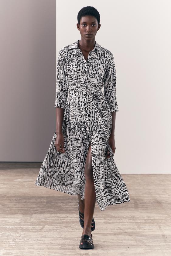 El primero que nos ha encantado es este vestido largo confeccionado en hilatura con mezcla de viscosa. Este original vestido tiene un original cuello solapa y manga por debajo del codo acabada en puño. Además, tiene un original estampado y un cinturón lazada en el mismo tejido y cierre frontal con botones. Este vestido camisero se puede encontrar en la web de Zara a un precio de 39,95 euros