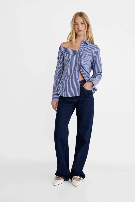 Dentro del catálogo de nueva temporada de Stradivarius ya puedes encontrar esta camisa asimétrica que ha conseguido captar la atención de lass que más saben de moda. Una de las cosas por las que más destaca es gracias a su estilo moderno y elegante. Estas características la convierten en la opción ideal para las mujeres estilosas que desean añadir un toque sofisticado a su armario. En este caso, la camisa clásica se reinventa con un escote asimétrico y muy moderno que se complementa a la perfección con el diseño de rayas en azul y blanco tan fácil de combinar. ¡No te la querrás quitar esta primavera!