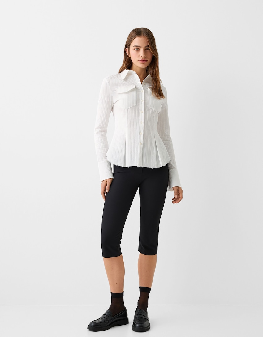 En el caso de que no sepas cómo combinar el pantalón más especial de Bershka, dentro de la sección de novedades de la tienda encontrarás una selección de prendas a la última moda que encajarán con este diseño a la perfección. Un buen ejemplo lo tienes en esta camisa de diseño entallado. Disponible en el siempre fácil de combinar e infalible color blanco, destaca por adaptarse a tu figura a la perfección realzando tu silueta. Además, la podrás combinar con cualquier tono de tu pantalón, convirtiéndose en otro de los básicos más interesantes de la temporada. En este caso, te puedes hacer con ella por tan solo 27,99 euros. Una gran oportunidad.