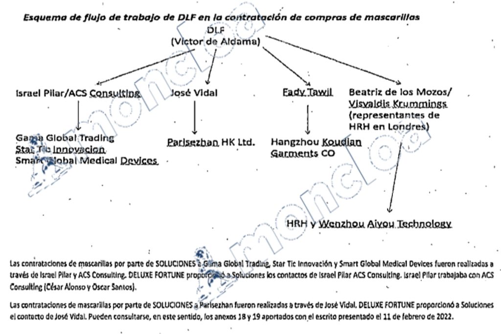 Además, trabajó con José Vidal para conseguir la distribución de Parisezhan HK LTD, mientras que Fady Tawil fue el encargado de cerrar el trato con Hangzhou Koudian Garments; y por último habló con Beatriz de los Mozos y Visvaldis Krummings para conseguir el contrato con HRH y Wenzhou Aiyou Technology. Aldama documentó gráficamente esta relación en el siguiente esquema: