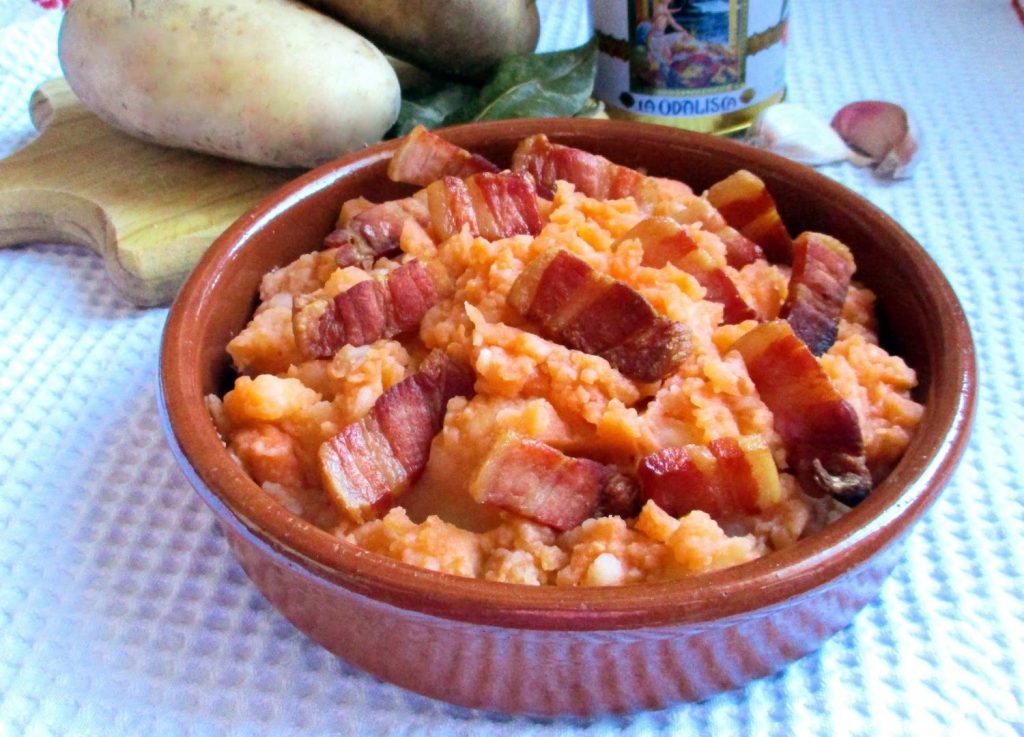 El nombre del plato proviene de la técnica de «revolcar» las patatas. Tras cocerlas, se aplastan y mezclan con un majado que incluye ajo, pimentón y aceite de oliva. Este paso es crucial para crear la consistencia cremosa y aromática que define a las patatas revolconas.