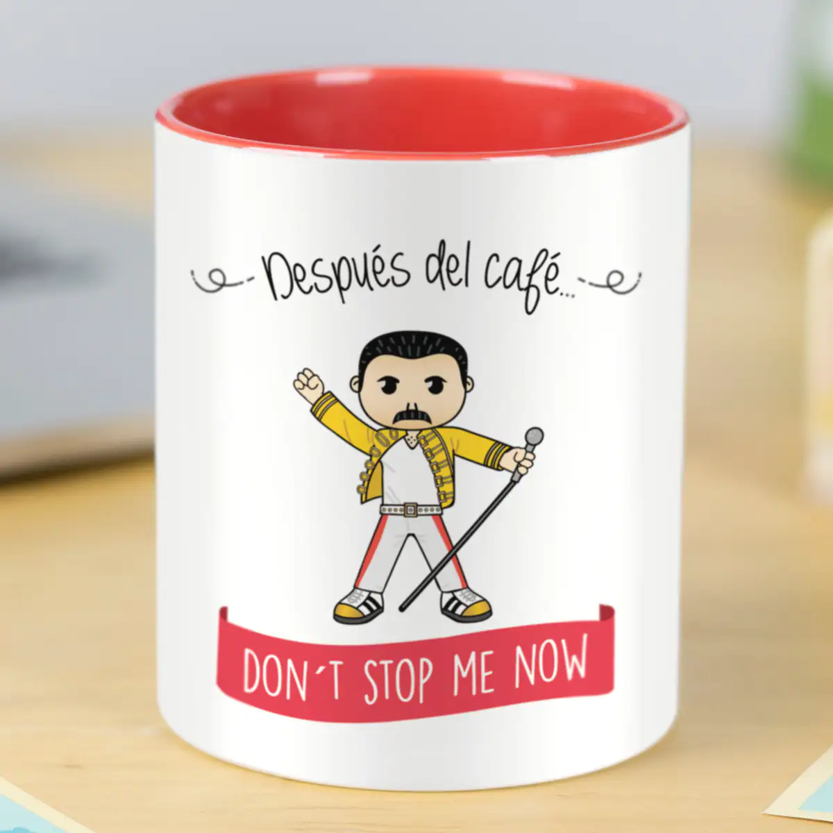 ¡Una taza perfecta para los amantes de Queen y del café! Con la frase «Después del café, Don’t stop me now» y un dibujo alusivo a la banda, esta taza de porcelana premium es resistente, elegante y duradera, al igual que los buenos momentos que acompañarán su uso.