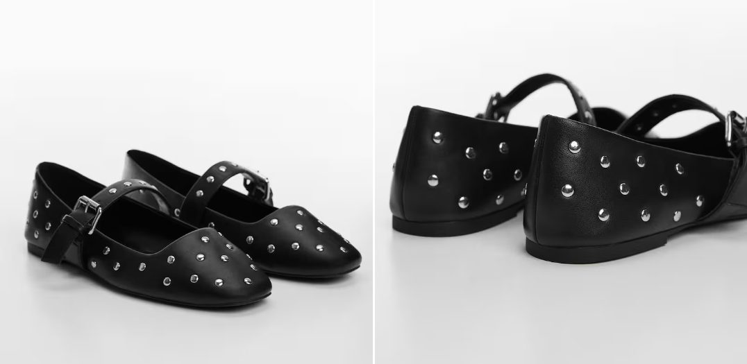Dentro de la sección de zapatos planos de Mango también te podrás hacer con opciones mucho más rockeras y de carácter moderno. Un buen ejemplo lo tienes en estas bailarinas de color negro que llaman la atención, sobre todo, gracias a su diseño con tachuelas plateadas. Asimismo, cuentan con una tira en el empeina para añadir comodidad que incluye una hebilla para adaptarlas al 100% a tu pie. En este caso, te puedes hacer con ellas ya en la tienda por tan solo 39,99 euros. No las querrás dejar escapar.