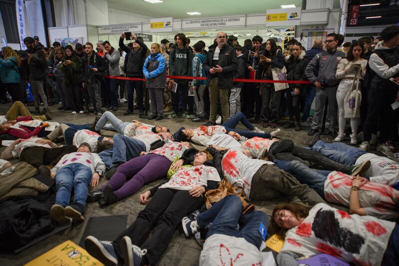 Los participantes han cantado lemas como ‘Fuera, fuera, fuera el Ejército del Saló’, ‘En este salón hay un estand manchado de sangre’ y ‘Las armas no educan, las armas reclutan’.