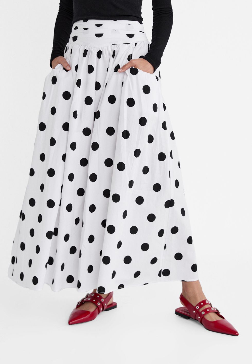 Stradivarius también piensa en las mujeres que están viviendo su segunda juventud. Bienvenidas al mundo de la moda primaveral para mujeres elegantes de 45 a 55 años. La falda larga de lunares de Stradivarius es la prenda perfecta para dar un toque de sofisticación a tu guardarropa esta temporada.
