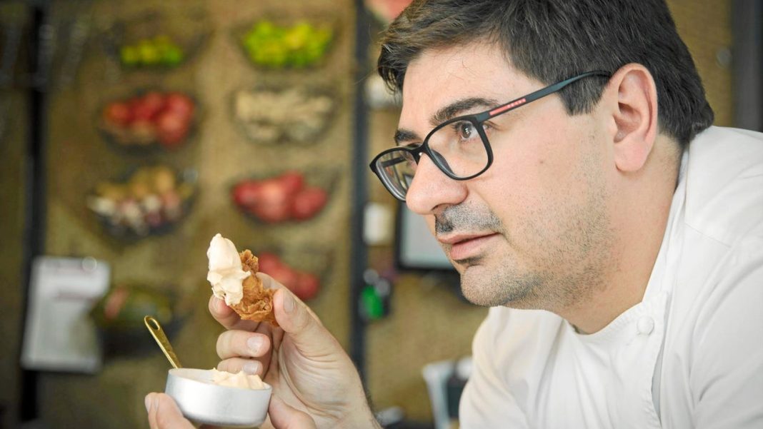 El ‘vitello tonnato’, un plato con profundas raíces en la tradición culinaria italiana, recibe una transformación en manos de Eugeni de Diego. Al sustituir el redondo de ternera por solomillo, y al enriquecer la salsa tonnata con ingredientes como las anchoas, el atún y las alcaparras, el chef nos ofrece una versión más refinada y contemporánea de este clásico. La presentación, cuidada hasta el último detalle, con rúcula, alcaparras y cristales de sal Maldon, refleja la filosofía de Diego: la cocina es también un arte visual.