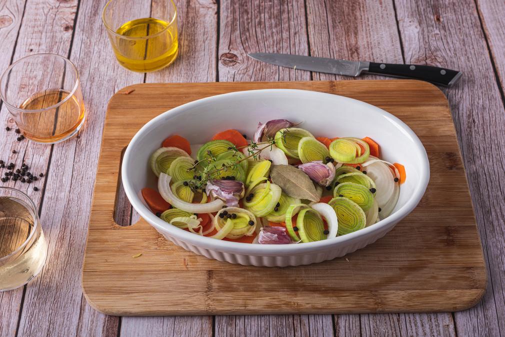 - Preparación de las verduras aromáticas. Comienza pelando y cortando la cebolla y la zanahoria en finas julianas. Luego, pela los ajos y córtalos en láminas. Para aportar un toque cítrico, rallar la piel de media naranja y reservar todos estos ingredientes para más adelante.