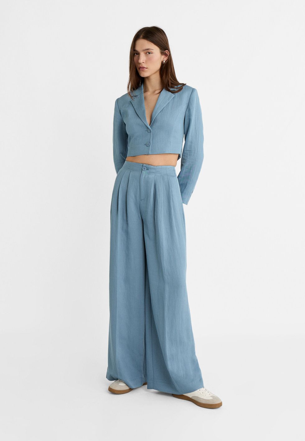 Descubre el encanto y la sofisticación en un conjunto de 2 piezas de Stradivarius, una opción elegante y versátil ideal para eventos especiales como comuniones, bautizos o cualquier ocasión que demande un toque de distinción. Este conjunto, compuesto por un blazer con una delicada abertura en la espalda y un pantalón palazzo, es la elección perfecta para recibir la primavera con estilo y elegancia.