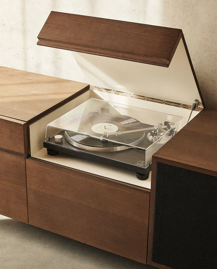Una buena opción puede ser este tocadiscos con aire retro de estética agradable y funcionamiento totalmente manual que es una de las joyas de la web de Zara Home. Este tocadiscos es el modelo AT-LPW30BK y es transmisión por correa diseñado para ofrecer una óptima reproducción de audio de un disco de vinilo. Cuenta con un plato profesional antiresonancia de aluminio fundido con alfombrilla de caucho. Un tocadiscos de dos velocidades (33-1/3 y 45 rpm) que cuenta con un plinto de madera de densidad media (DM) antiresonancia que reduce la retroalimentación acústica de frecuencias bajas.