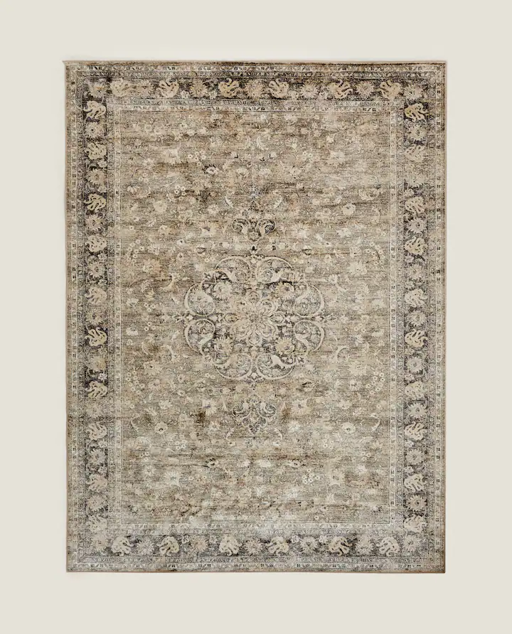 También nos parece una buena opción esta alfombra de viscosa en color crudo con efecto vintage y dibujos florales en tonos oscuros. La parte delantera de esta alfombra es 100% viscosa y la trasera un 5% de fibras mixtas, un 48% de poliéster, 4% de acrílico, 29% de algodón y 14% de viscosa. Se pueden adquirir en Zara Home en dos medidas 160 x 230 cm que está en la web rebajada a 79,99 euros en vez de 119,99 euros que es su precio habitual y la de 200 x 300 cm. a 119 euros en vez de 149 euros.