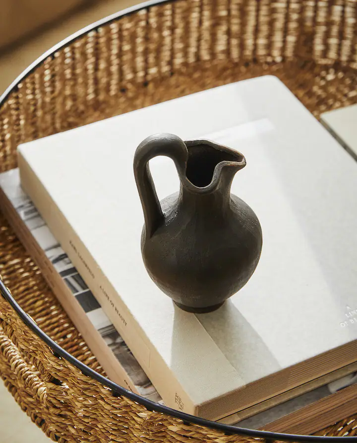 Otro objeto decorativo que puede quedar genial en tu salón vintage es esta jarra decorativa con asa fabricada en gres que sorprende por su original diseño. Una original jarra decorativa que pesa solo 288 gramos y que tiene de alto 15 cm., de ancho 10 cm. y un fondo de 9 cm. Una preciosa jarra en tono oscuro que puede quedar genial en cualquier rincón de un salón vintage.