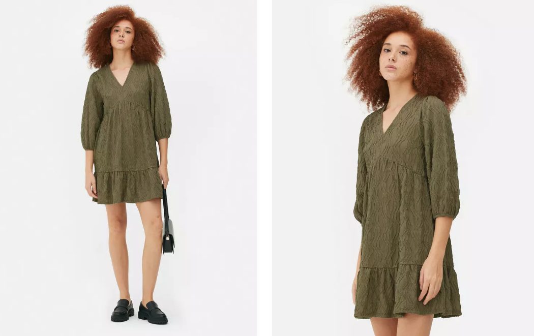 También corto es este vestido que te servirá para esos días de primavera en los que el calor no está demasiado presente. Gracias a su manga princesa, cuenta con un toque elegante infalible, algo que se completa con su acabado texturizado, su volante en la zona inferior, así como por su cuello en pico. Sin duda, destaca gracias a su bonito color verde caqui, gran tendencia de esta temporada. También disponible en negro, apto para combinar con todo, te puedes hacer ya con él por tan solo 16 euros en la tienda.