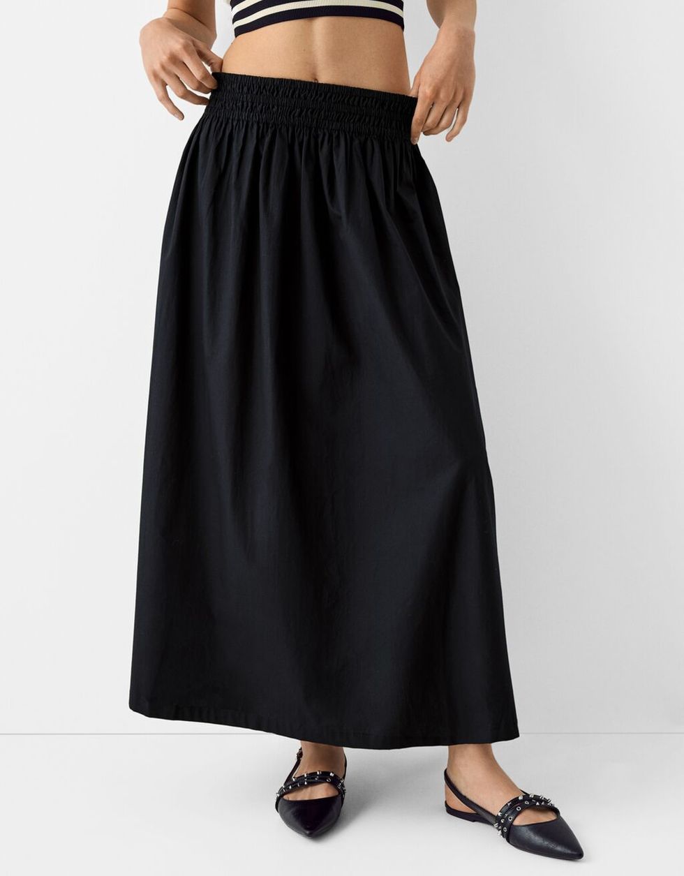Imagina que un inspector de moda recorre todas las redacciones del mundo en busca de las prendas más destacadas. ¿Qué encontraría? Con alta probabilidad, descubriría la maravillosa falda que Bershka tiene para ofrecer. Esta prenda desafía cualquier expectativa preconcebida sobre la marca, demostrando que va mucho más allá de su reputación juvenil. Se trata de una falda midi negra, con un elegante vuelo y una cintura elástica que realza la figura.