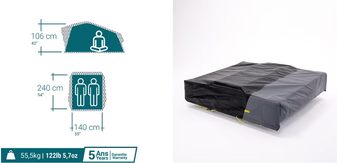 Otra de las cosas por las que destaca esta tienda de Decathlon es por ser robusta y duradera. Su tejido principal es 100% poliéster y viene equipada con una estructura realizada en aluminio. Asimismo, cuenta con nada menos que 5 años de garantía, asegurándose de ser una inversión a largo plazo. Por su parte, cuenta con una resistencia al vieno de hasta 60 km/h y sus medidas son 140 cm de ancho, 240 cm de largo y 106 cm de alto. En cuanto a su peso, es de 48,5 kg más la escalera, que pesa 7 kg. Tiene ventilaciones mecánicas y también doble techo, reduciendo el calor.