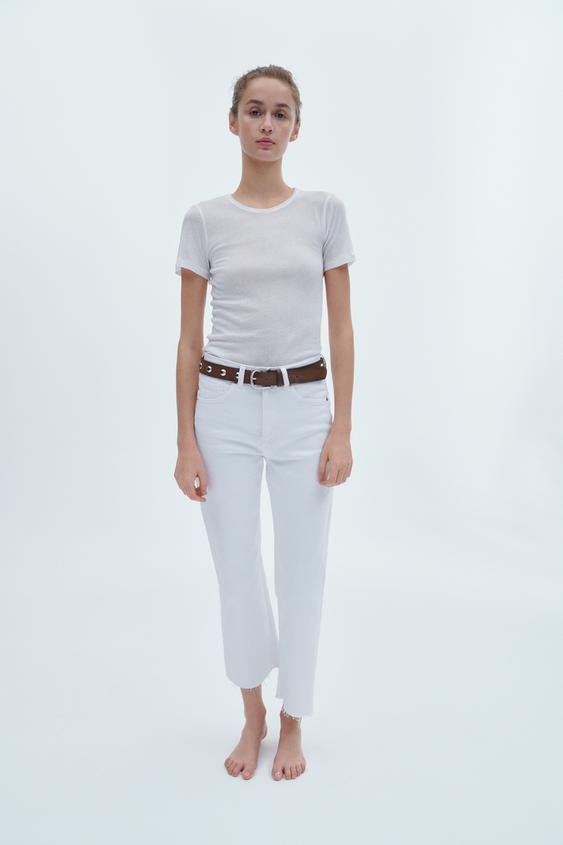 Otros pantalones que nos han encantado y que son perfectos para la primavera son estos jeans de tiro alto con cinco bolsillos. Un vaquero clásico confeccionado con un 98% de algodón y un 2% de elastano que destacan por su bajo acabado cropped flare sin costuras y su cierre frontal con cremallera y botón metálico. Son de largo tobillero y están disponibles en los tonos: blanco, negro, azul y gris. Se pueden encontrar en la web de Zara en tallas de la 32 a la 44 y cuestan solo 25.95 euros.