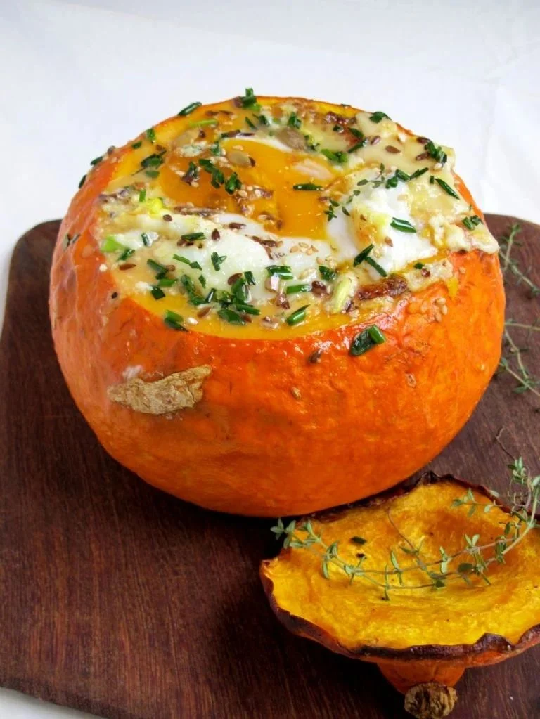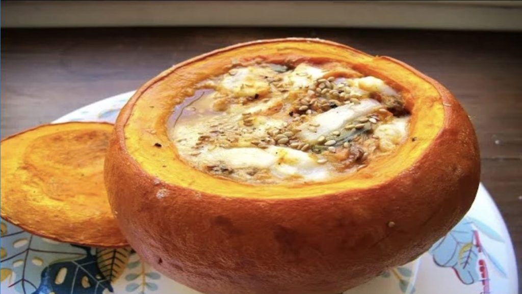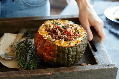 - Vuelve a coloca las mitades del zapallo rellenos en la bandeja para horno.