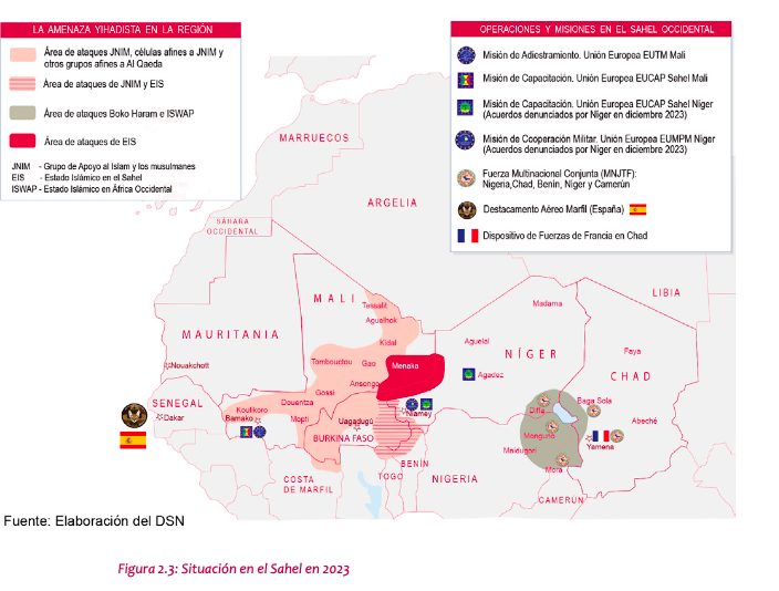 El deterioro de la situación en la región del Sahel afecta negativamente a España al igual que el conflicto en Gaza e Israel. Para Seguridad Nacional, estos conflictos provocan radicalización y la movilización de los entornos yihadistas y las claves para su control se basarían en la capacidad de detectar estos procesos de autorradicalización «y dificultar el acceso a herramientas que les permitan sofisticar sus planes, tales como armas de fuego o precursores de explosivos». España mantiene varias misiones militares de apoyo en el Sahel.