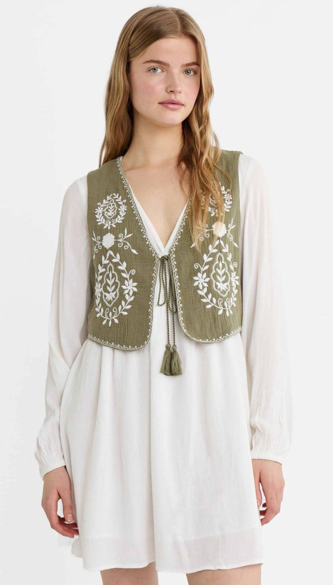 Una de las últimas incorporaciones de la reconocida marca Stradivarius es este vestido mini con chaleco bordado, una pieza única que combina lo clásico con lo moderno de una manera sorprendente. El vestido en sí es de un blanco puro y elegante, con mangas largas que le dan un toque sofisticado. Pero lo que realmente destaca es el chaleco corto en un vibrante tono verde caqui, que se cierra con un cordón sutil y está adornado con un hermoso bordado floral en relieve que añade un toque de frescura y originalidad a la prenda.