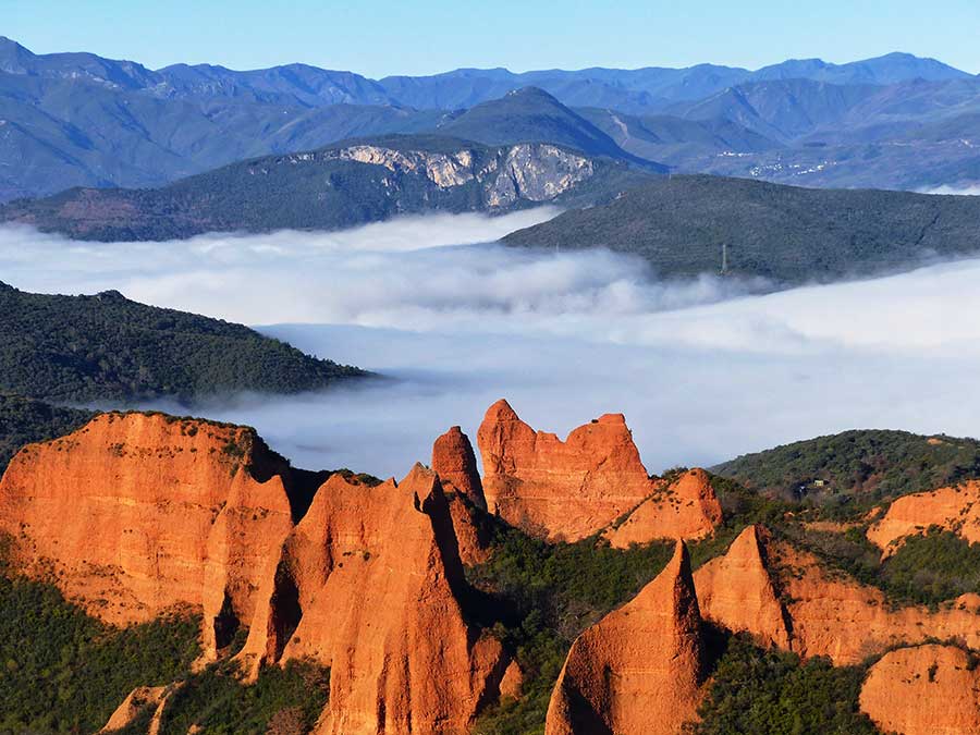 Las Médulas, declaradas Patrimonio Mundial, son el resultado de la mayor explotación aurífera a cielo abierto de todo el Imperio romano. Se ubican en El Bierzo, al noroeste de los Montes Aquilanos, junto al valle del río Sil, en la provincia de León. Esta zona se caracteriza por una impresionante estampa rojiza de picudos farallones que ocultan en su interior el codiciado oro, como se aprecia en la foto.
