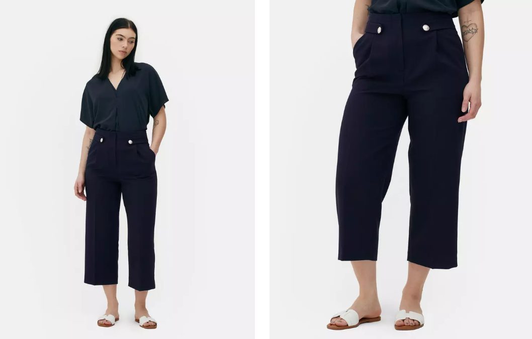 Este pantalón de diseño recto en la parte de abajo y ajustado en la cintura es la prenda que necesitas para estilizar al máximo tu figura. Disponible en el color azul marino más elegante, así como en color camel, será tu favorito para crear tu propio traje de primavera o de verano. Uno de los detalles por los que consigue conquistar es gracias a sus dos botones delanteros, elaborados en el tono dorado que mejor contraste hace. Con diseño por encima del tobillo, para alargar aún más la pierna, te puedes hacer con ellos por solo 18 euros. No los podrás dejar escapar.