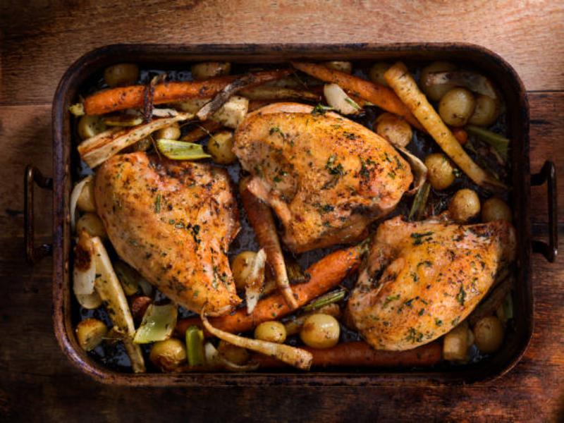 Precalienta el horno a 200 °C. Corta las pechugas de pollo en filetes delgados y sazónalas con hierbas frescas como romero, tomillo y orégano, así como con ajo picado y jugo de limón. Coloca los filetes de pollo en una bandeja para hornear junto con tus vegetales favoritos, como zanahorias, calabacines, pimientos y champiñones, todos cortados en trozos. Rocía todo con un poco de aceite de oliva y sazona con sal y pimienta al gusto. Hornea durante aproximadamente 25-30 minutos, o hasta que el pollo esté cocido y los vegetales estén tiernos y dorados. Sirve caliente y disfruta de una comida reconfortante y saludable.