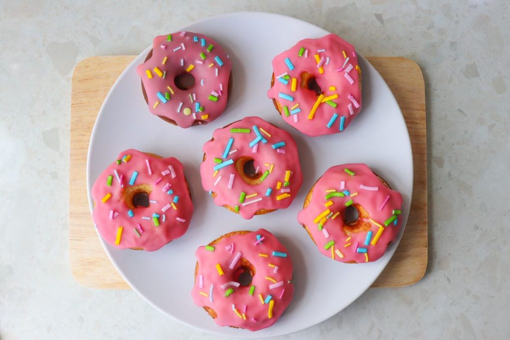 Luego, se hornean a 180°C durante aproximadamente 15 minutos hasta que estén dorados y cocidos. Una vez fríos, los decora sumergiéndolos en un delicioso chocolate blanco teñido con colorante rosa, y finaliza la presentación agregando unos divertidos sprinkles de colores. ¡Y así de sencillo, tendrás listos unos irresistibles mini donuts con un toque de color y sabor para disfrutar en cualquier ocasión!