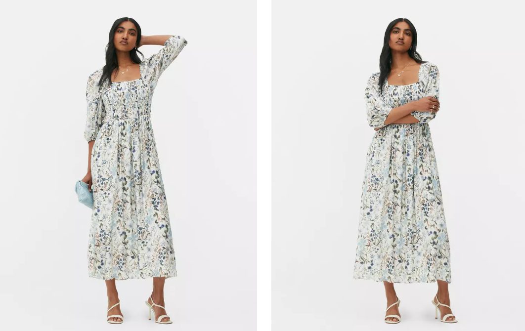Otro vestido midi que resulta de lo más favorecedor es este. De diseño floral, en este caso en tonos azulados sobre fondo claro, se trata de una prenda muy especial gracias a su cuerpo fruncido, que le da un toque de lo más sofisticado. Con escote cuadrado, que siempre queda bien con todo, y manga princesa, te servirá para esos eventos de primavera en los que necesitas un extra de elegancia sin renunciar a la comodidad. Fácil de combinar y de lucir con cualquier tipo de calzado, lo tienes ya disponible en Primark por tan solo 28 euros.