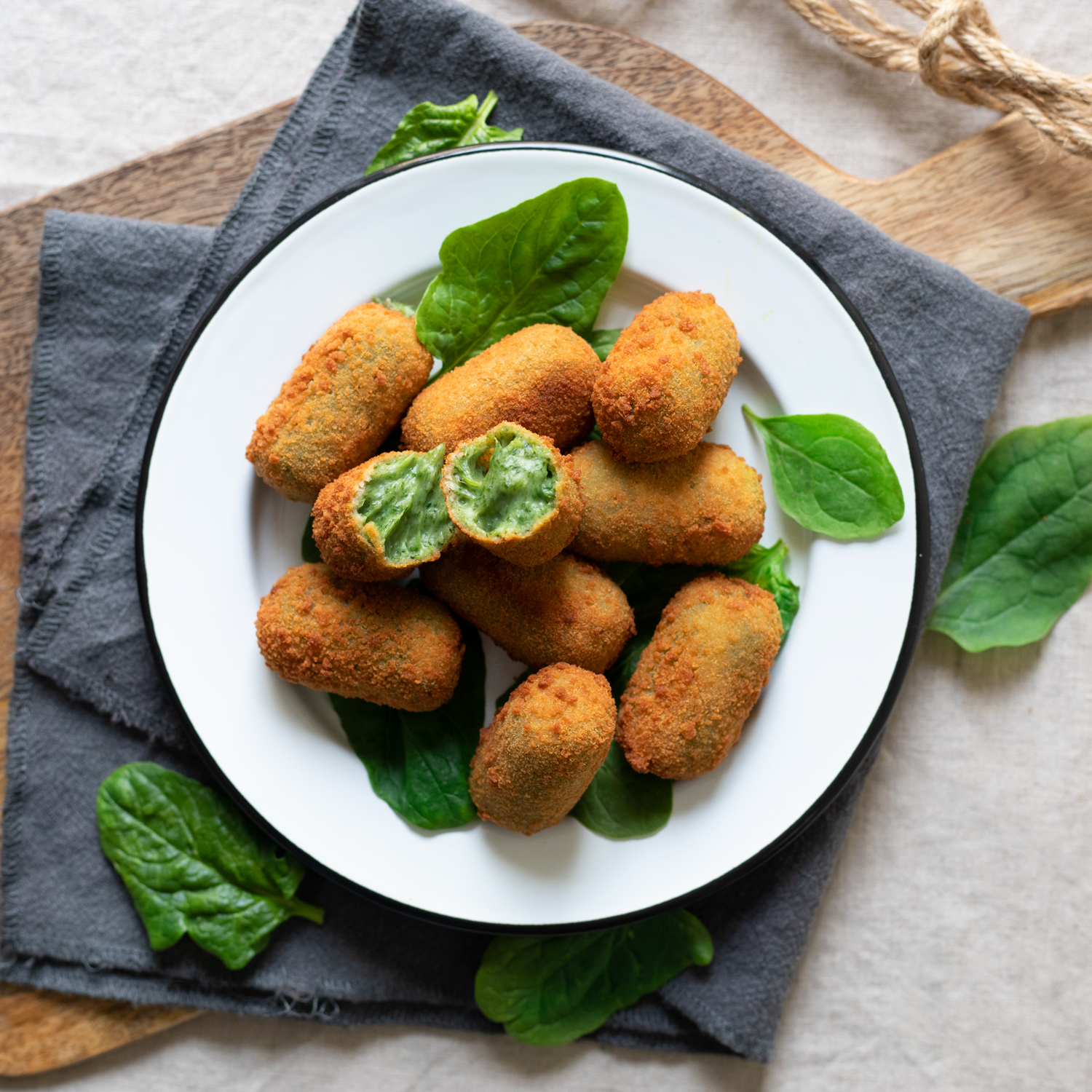Nuestras croquetas de espinacas y queso azul son una combinación perfecta de sabores y nutrientes. El queso azul aporta un toque de sabor intenso y cremoso, mientras que las espinacas añaden un toque de frescura y un alto contenido de vitaminas y minerales. ¡Una manera deliciosa de incorporar más verduras a tu dieta!