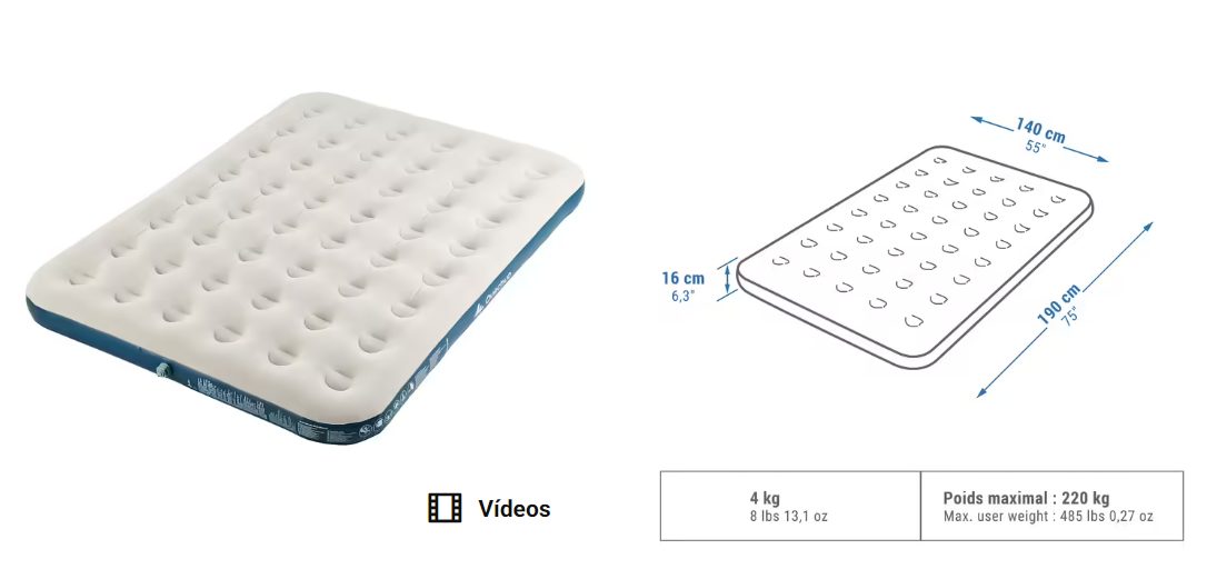 Para incrementar la comodidad en tus escapadas, nada mejor que elegir un colchón doble como este, ya disponible también en Decathlon. Es hinchable, para que lo puedas transportar de manera cómoda y cuenta con un grosor de 16 cm. Asimismo, se ha diseñado pensando en quienes buscan un descanso confortable de forma económica, algo que logra gracias a detalles como su tacto de terciopelo, que incrementa la calidad del sueño. Fácil de hinchar, en tan solo 1 minutos y 40 segundos, resiste un mínimo de 60 ciclos de inflado y tiene una garantía de 3 años. En cuanto a su precio, te puedes hacer con él por solo 28,99 euros.