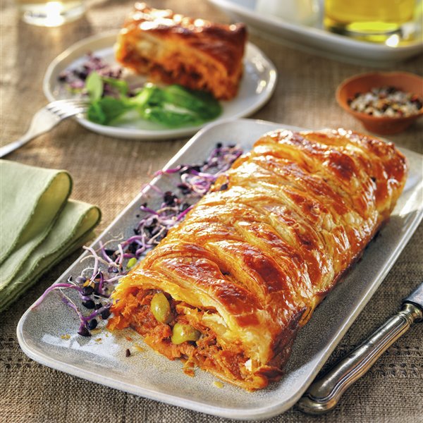No podemos olvidarnos de un toque final que elevará nuestro plato a la categoría de obra maestra: la salsa de yogur con miel y cebollino fresco. Mezcla el yogur con la dulzura de la miel y el toque refrescante del cebollino picado, creando una salsa que despertará tus sentidos y complementará a la perfección el sabor del hojaldre y las patatas. Para añadir un toque crujiente, cuece el jamón en el microondas durante 2 minutos y trocéalo para añadirlo como un toque final.