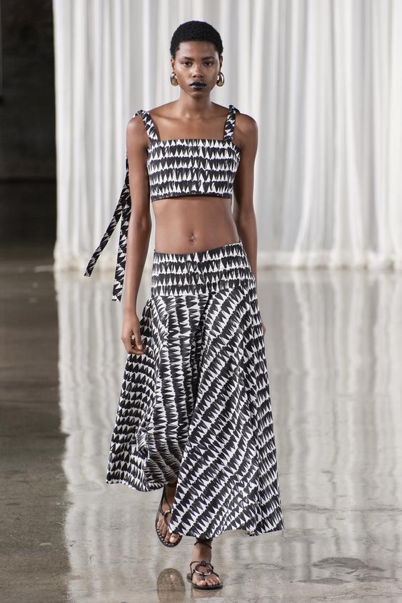 Esta falda cuenta con un original y favorecedor top corto a juego disponible también en la web de Zara a un precio de 25,95 euros. Esta falda estampada se puede encontrar en la web de Zara en las tallas de la XS a la XL y a un precio de 59,95 euros. Si te encanta esta falda estampada, acude pronto a las tiendas de la conocida firma porque quedan pocas unidades en algunas tallas.